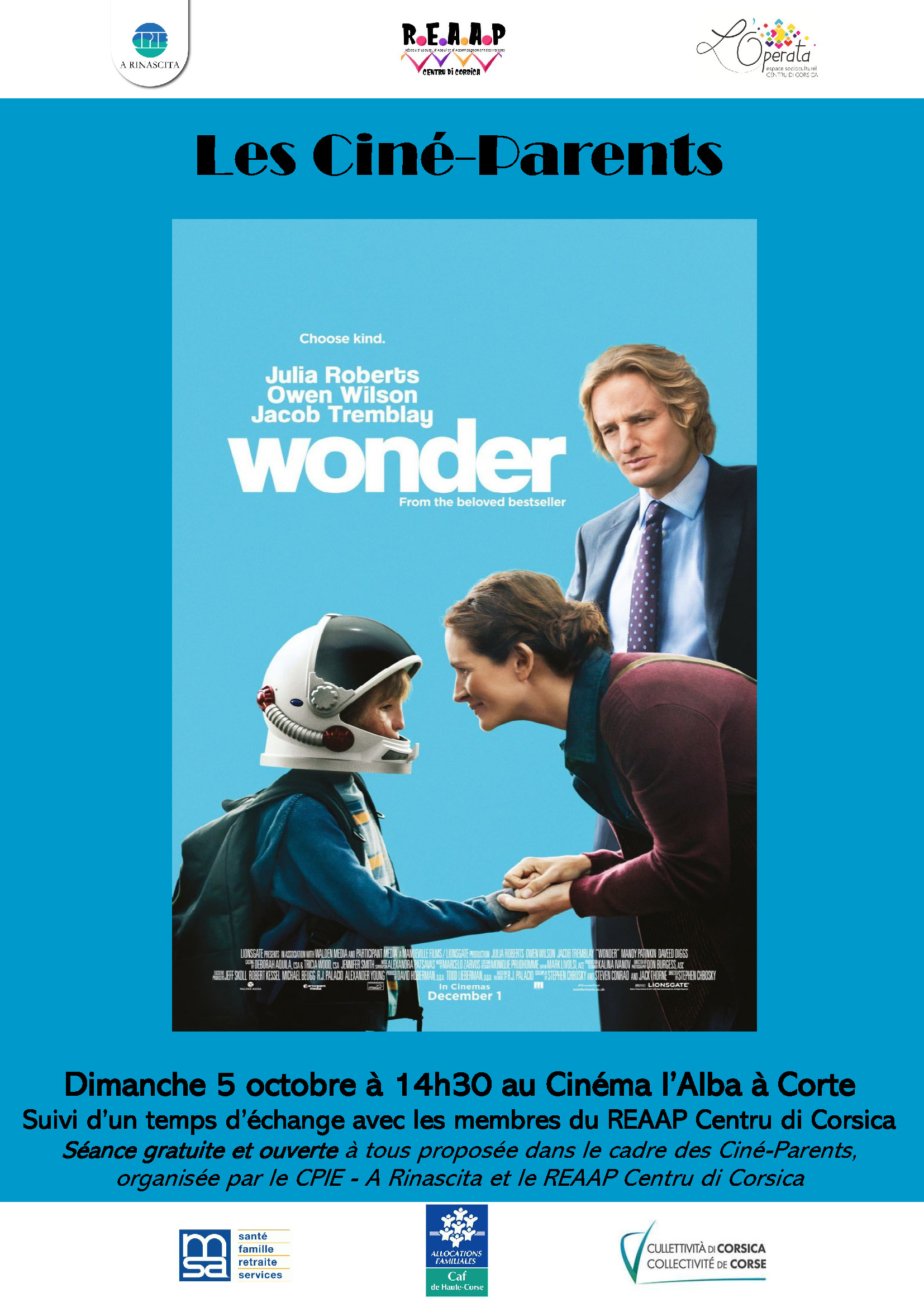 Rendez-vous donc dimanche 5 octobre à 14h30 à L'alba Cinéma Corte pour la première séance des Ciné-Parents de l'année avec le poignant film Wonder avec Julia Roberts et Owen Wilson.