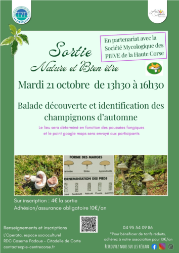 Rendez vous mardi 21 octobre de 13h30 à 16h30 pour une ballade découverte et identification des champignons d'automne.