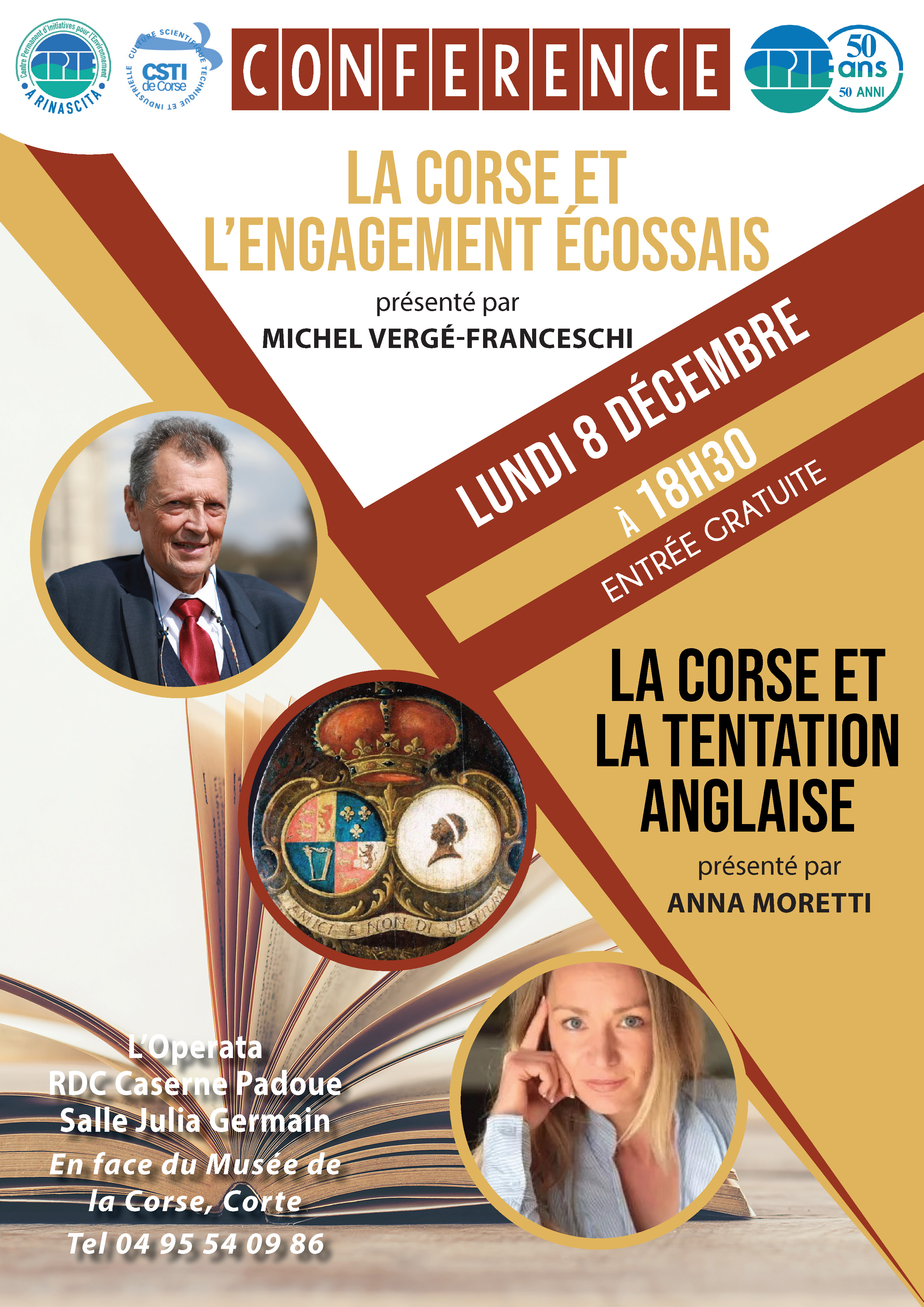 Lundi 8 décembre à 18h30, dans le cadre de son Cinquantenaire, le CPIE A Rinascita vous invite à la conférence historique « La Corse sur l’échiquier européen » dans la salle Julia Germain de l’Operata, au RDC de la caserne Padoue - Citadelle de Corte.