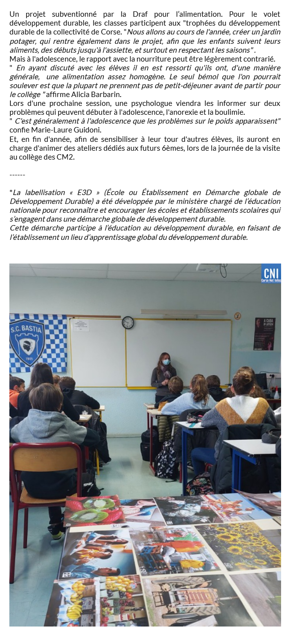 Ce projet, en partenariat avec la DRAAF-ARS et le collège de Calvi vise à mettre en place au sein du collège un programme d’action permettant de sensibiliser l’ensemble des élèves de 5ème à l’équilibre alimentaire en lien avec l’environnement.