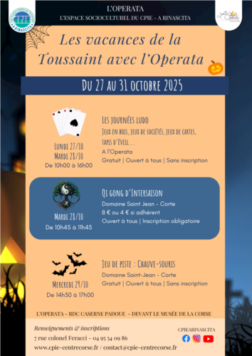Sortie Nature, le 29 octobre de 14h30 à 17h, avec jeu de piste sur les chauve-souris dans le domaine Saint Jean, ou journées ludothèque, les 27 et 28 de 10h à 16h, avec jeux en bois, jeux de sociétés, jeux de cartes et autres, dans les locaux de l’Operata.