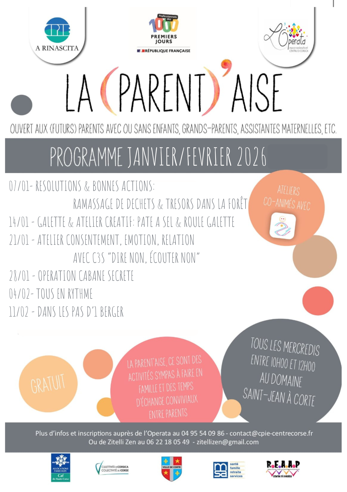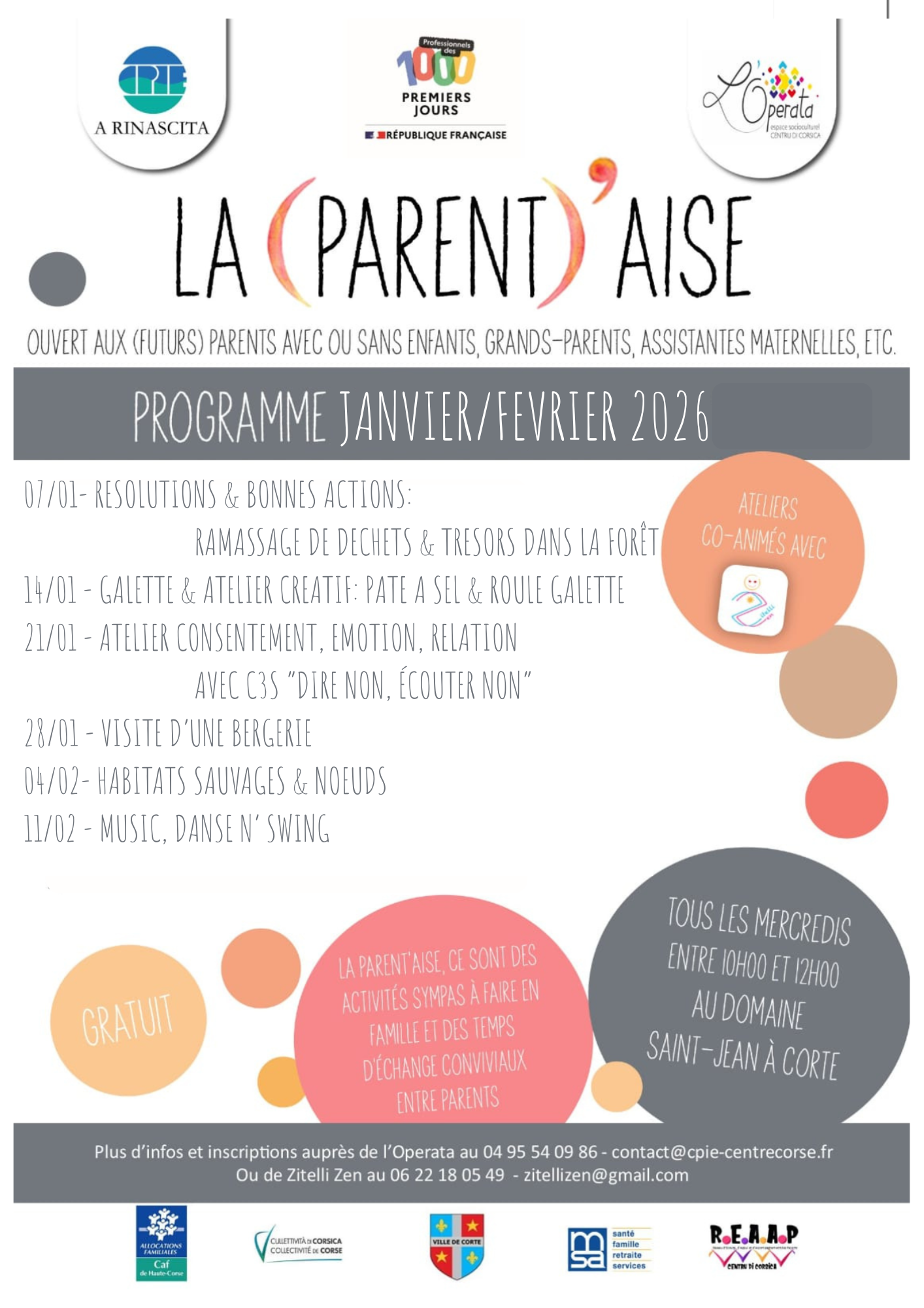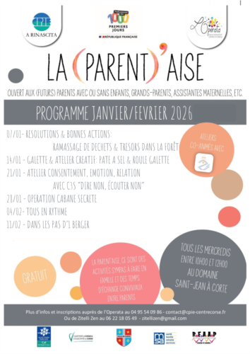 Animés par Julie, notre référente famille au sein de l'Operata, l’espace socioculturel du Centre Corse, et Emmanuelle de Zitelli Zen, ces ateliers gratuits et sans contraintes d'inscription ou d'engagement, sont ouverts aux (futurs) parents, grands-parents, assistantes maternelles et toutes personnes qui souhaitent échanger sur la parentalité, la famille et l'éducation.