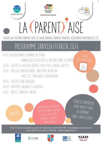 La Parent'aise, rendez-vous hebdomadaire des parents, vous accueille tous les mercredis matin au domaine Saint-Jean à Corte ou à l'Operata, en vous proposant des activités à faire en famille et des temps de rencontres et d'échanges entre parents sur des sujets variés.