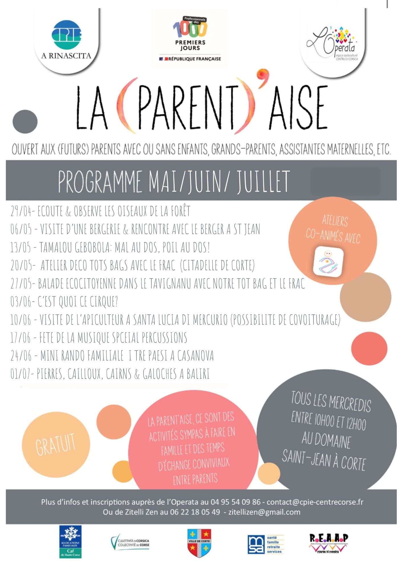 La Parent'aise, rendez-vous hebdomadaire des parents, vous accueille tous les mercredis matin au domaine Saint-Jean à Corte ou à l'Operata, en vous proposant des activités à faire en famille et des temps de rencontres et d'échanges entre parents sur des sujets variés.