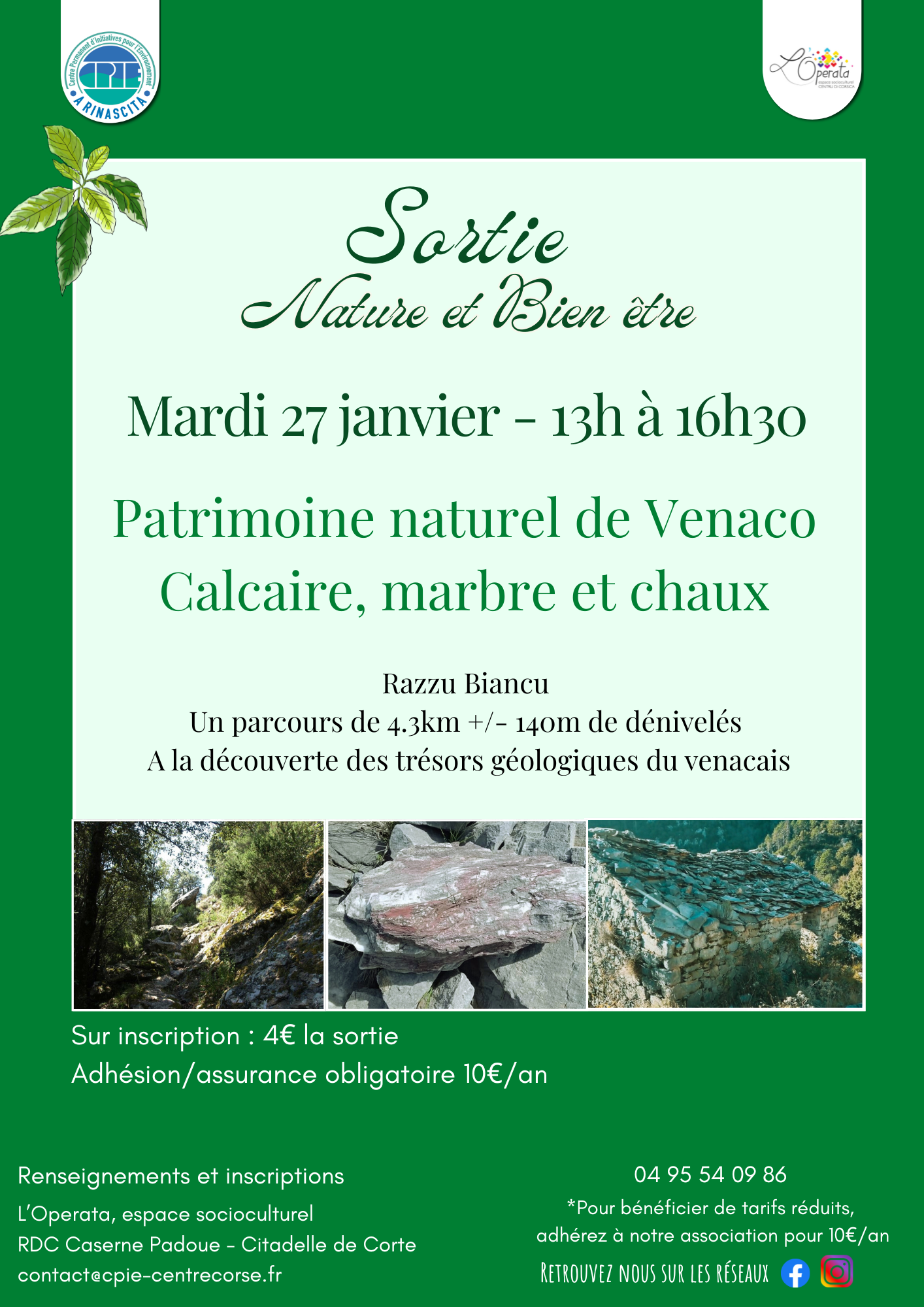 Rendez vous mardi 27 janvier de 13h à 16h30 pour une sortie Nature, Patrimoine naturel de Venaco : calcaire, marbre et chaux.