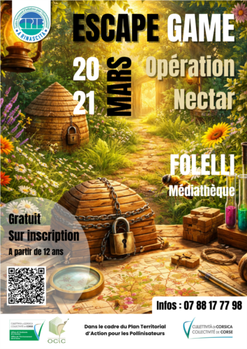 Dans le cadre du Plan Territorial d’Action « Pollinisateurs » porté par l’Office de l'Environnement de la Corse, le CPIE A Rinascita vous invite à la Médiathèque de Folelli, les vendredi 20 et samedi 21 mars, entre 9h30 et 16h30, pour participer à l'Escape Game "Opération Nectar" et découvrir le rôle essentiel, les menaces et les différentes facettes des pollinisateurs.