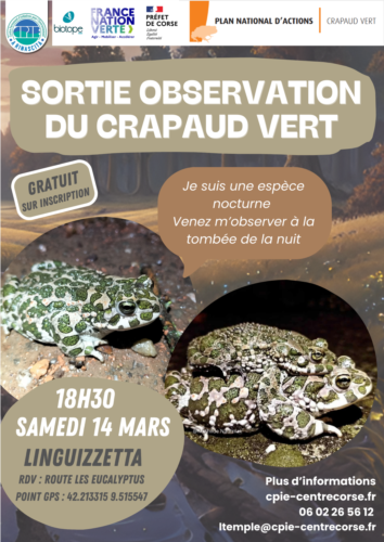 Samedi 14 mars à 18h30, dans le cadre du Plan national d'actions Crapaud Vert financé par le Ministère Écologie Territoires, nous vous convions à une expérience unique d'observation du Crapaud Vert à Linguizzetta.